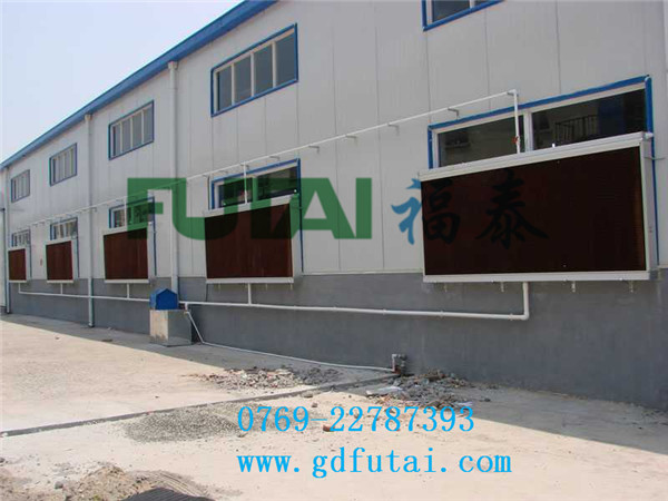 水簾墻降溫系統(tǒng)是水蒸發(fā)吸熱原理,負(fù)壓通風(fēng)原理,來(lái)排出廠(chǎng)房?jī)?nèi)的廢氣、污氣及解除高溫悶熱。